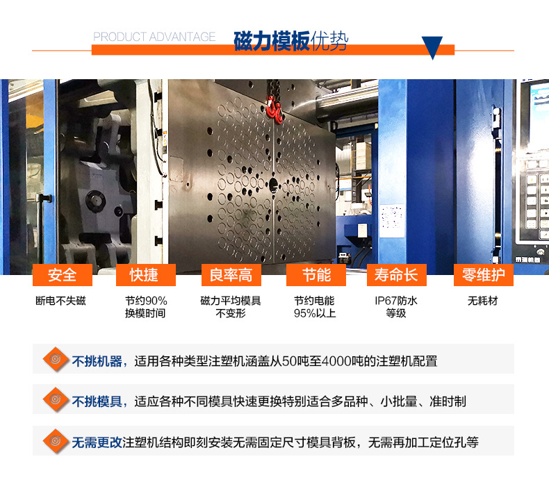 立式注塑機(jī)是目前中國發(fā)展最快的塑料機(jī)械之一,與工業(yè)發(fā)達(dá)國家的距離很近。 越來越多的制造業(yè)開始用磁性模板代替手動(dòng)更換模具。 悍威磁電開發(fā)生產(chǎn)的磁性模板與立式注塑機(jī)的配套使用,增強(qiáng)了公司的核心競(jìng)爭力。